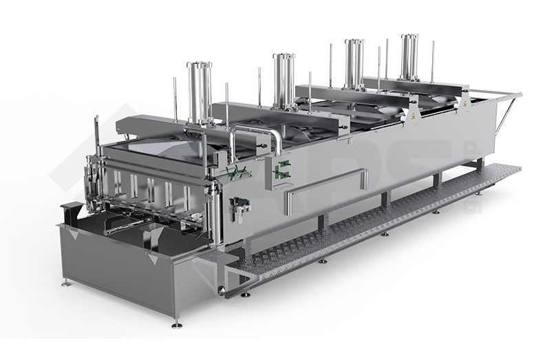 Узлы прессования пласта представляют собой мостовые конструкции, расположенные над ванной. На каждый из мостов установлен пневмоцилиндр. На штоках пневмоцилиндрах находятся прижимные плиты, посредством которых давление от пневмоцилиндров равномерно распределяется по плоскости пласта продукта. Для освобождения рабочего пространства два узла являются откидными. Два узла откатываются за пределы формования.